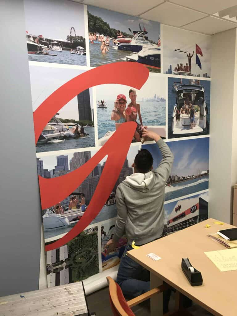 A man in a gray hoodie stands on a step ladder, applying or adjusting a wall decal for the Chicago Electric Boat Company and Jefferson Beach Yacht Sales inside a building. A bag sits on the floor nearby.